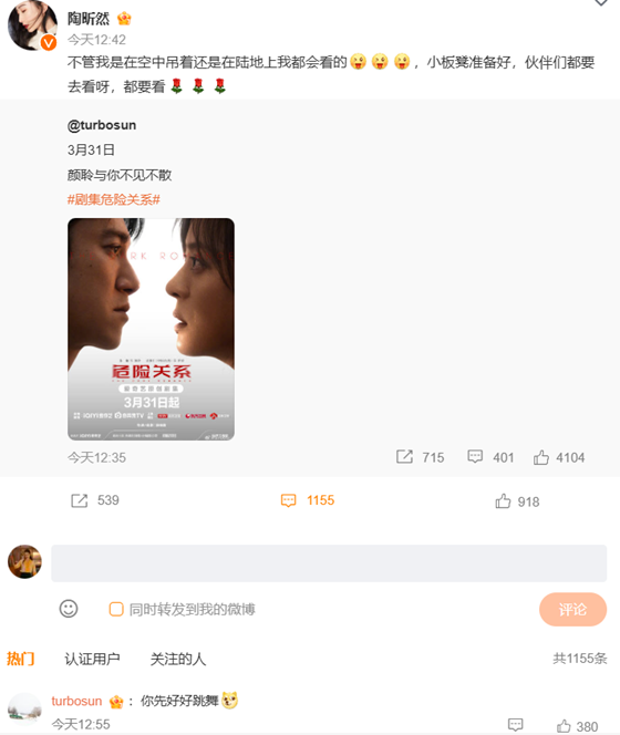 3月28日当天,陶昕然同步孙俪的《危险关系》宣推动态,配文写道:“不管我是在空中吊着还是在陆地上我都会看的,小板凳准备好,伙伴们都要去看呀,都要看”。看似简单的一句话,既藏着对好友新作品的全力支持,也暗合了《乘风2026》的备战状态,俏皮又暖心。随后,孙俪迅速现身评论区,一句“你先好好跳舞”温柔回应,短短6个字,既有姐妹间的调侃,也有对陶昕然浪姐舞台的期待,默契感拉满。